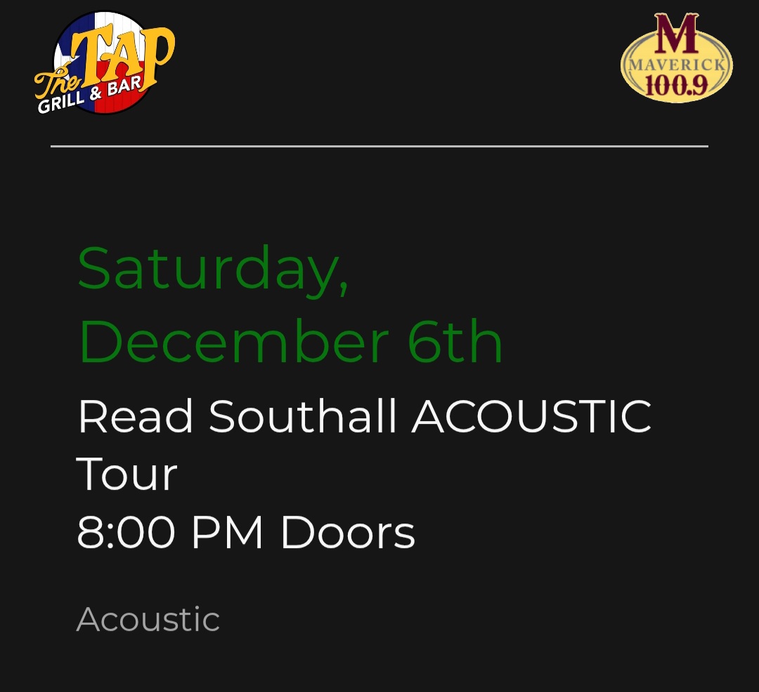 Read Southall Posted by corlissniethamer on October 8, 2025 in Events > 2025 > December > Read SouthallNoMaybeI'm AttendingAbout this event:Created by corlissniethamerTakes place on December 6, 2025 The Tap 815 Harvey Rd, College Station, TX 77840 Share on Facebook Share on Twitter Get tickets at www.TheTapBCS.com and listen for more info weekdays from 5PM – 6PM during “The Tap’s Front Porch Happy Hour” on Maverick 100.9 Share on Facebook Share on Twitter