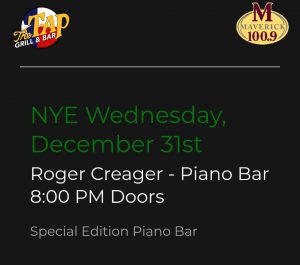 Roger Creager’s NYE Piano Bar Posted by corlissniethamer on October 8, 2025 in Events > 2025 > December > Roger Creager's NYE Piano BarNoMaybeI'm AttendingAbout this event:Created by corlissniethamerTakes place on December 31, 2025 The Tap 815 Harvey Rd, College Station, TX 77840 Share on Facebook Share on Twitter Get tickets at www.TheTapBCS.com and listen for more info weekdays from 5PM – 6PM during “The Tap’s Front Porch Happy Hour” on Maverick 100.9 Share on Facebook Share on Twitter