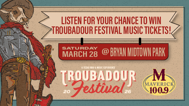 Maverick 100.9 has your chance to win Troubadour Festival music tickets that will get you in just in time to see all the artists on the Main Stage!  This year’s headliners are Robert Earl Keen and Flatland Cavalry! They’ll be joined by Waylon Wyatt, Jason Boland and the Stragglers, Tyce Delk and more! Listen for your chance to Text-to-Win!